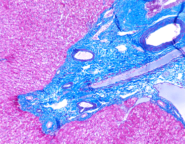 • The Result of Staining : collagen fibrous are blue (stained by aniline blue), and muscle fibrous are red (stained by acid magenta and ponceau)